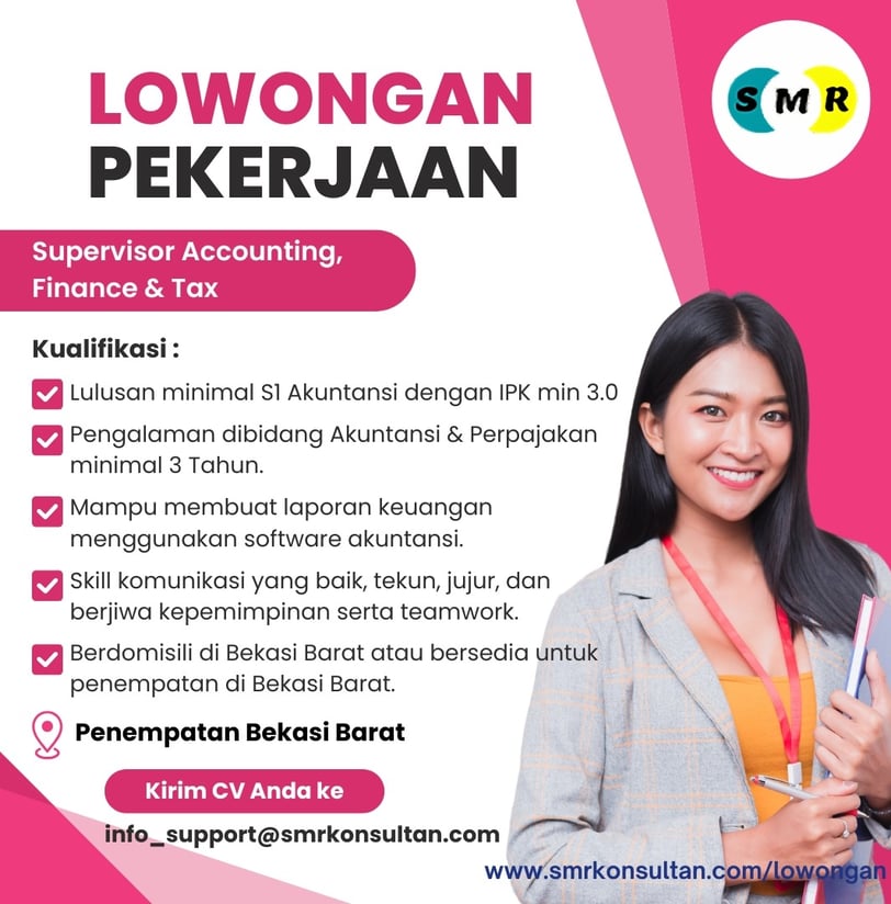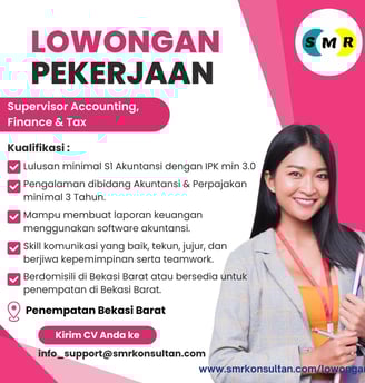 SMR Konsultan Pajak Profesional Bekasi membuka kesempatan bagi para profesional yang berpengalaman di bidang Akuntansi, Keuangan, dan Perpajakan untuk bergabung sebagai Supervisor Accounting, Finance & Tax. Kami mencari kandidat yang berdedikasi untuk memperkuat tim kami dalam meningkatkan kinerja keuangan dan perpajakan. Penempatan di Bekasi Barat, dengan fleksibilitas untuk kandidat dari berbagai lokasi.